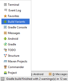 2 - The first step in the process of generating a signed application APK file involves changing the build variant for the project from debug to release. This is achieved using the Build Variants tool window which can be accessed from the tool window quick access menu (located in the bottom left hand corner of the Android Studio main window as shown in Figure bellow