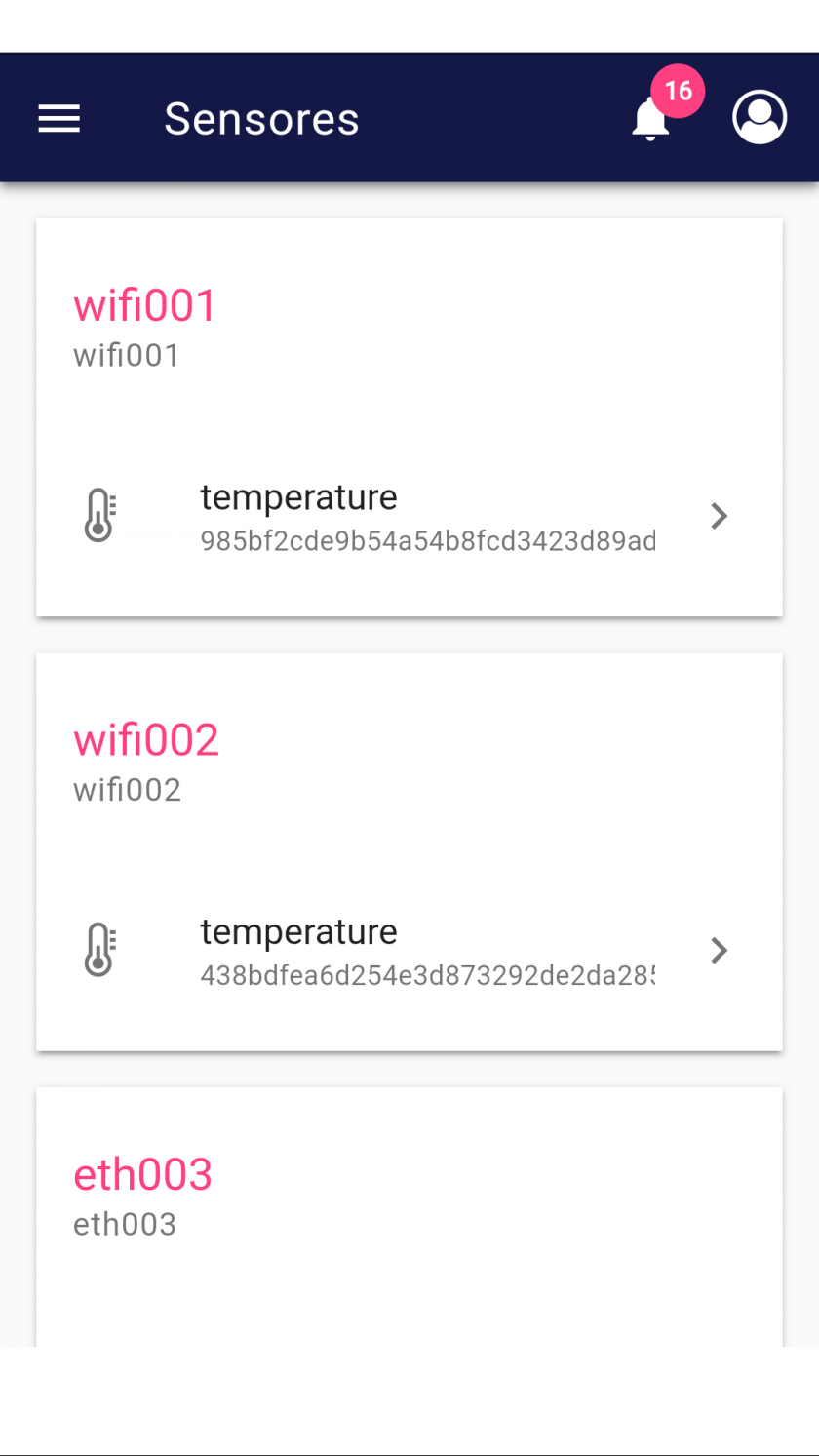 John Doe adquiriu 3 sensores compatíveis com a plataforma proposta. Ao abrir o aplicativo, com sua conta, registrou os 3 sensores no app, cada um para um propósito diferente, o primeiro "Controle de ambiente do escritório", monitorando "Temperatura", em ºC, e "Luminosidade", em lux. O segundo, "Freezer do armazém", medindo apenas "Temperatura", em ºC. O terceiro, "Oxigenação do aquário", monitorando a concentração de "Oxigênio", em mg/L.
