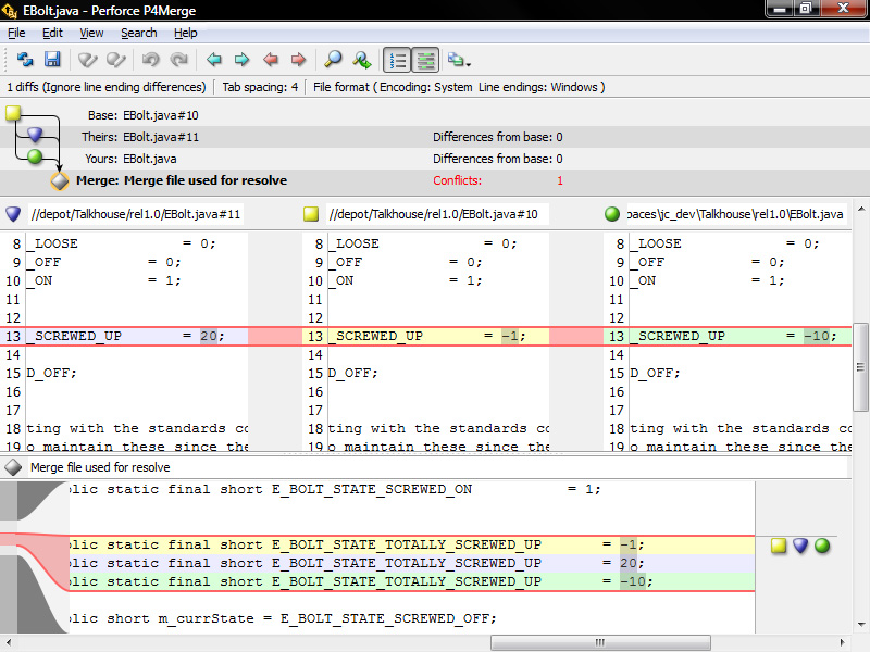 O SourceTree não oferece ferramenta própria para merge e diff, porém permite a configuração de aplicações externas para realizar essas operações. O P4Merge atende o uso comum, como uma aplicação de 3-way merge tool, freeware e que é suportada pelo SourceTree. E há casos mais específicos, no caso de sistemas desenvolvidos em Curió, para os quais é necessária uma ferramenta para lidar com eventuais conflitos nos arquivos de modelo (.uml). O Oso XML Merge cumpre esse papel, onde ferramentas como o P4Merge, WinMerge, ou Meld falham ao interpretar diferenças em arquivos baseados em xml.