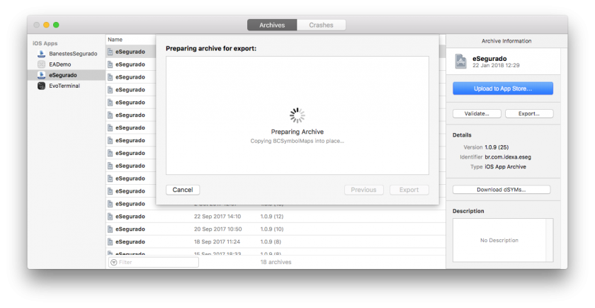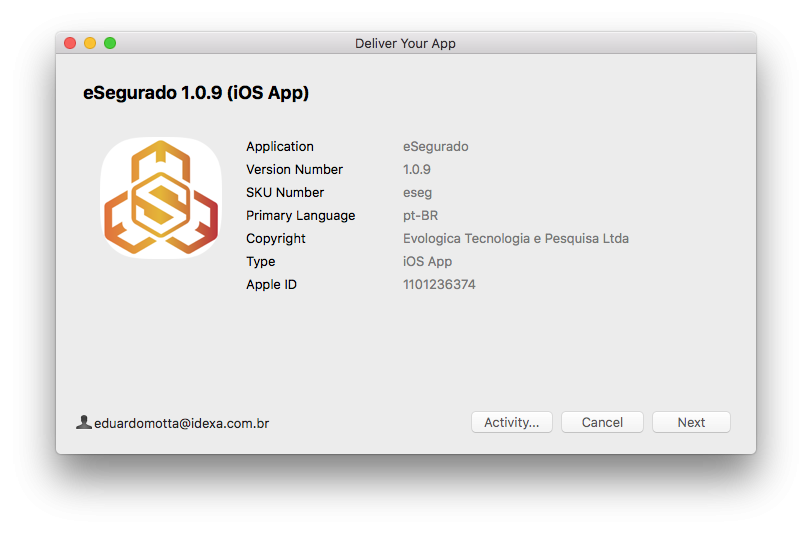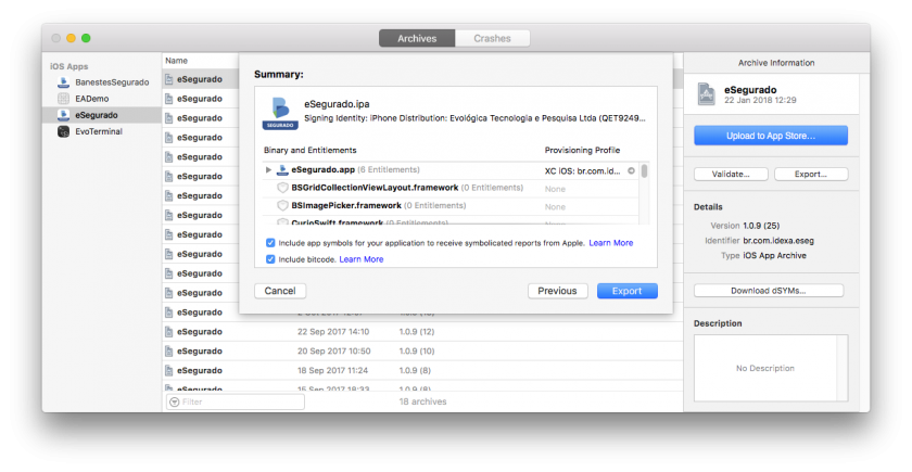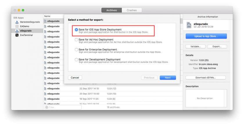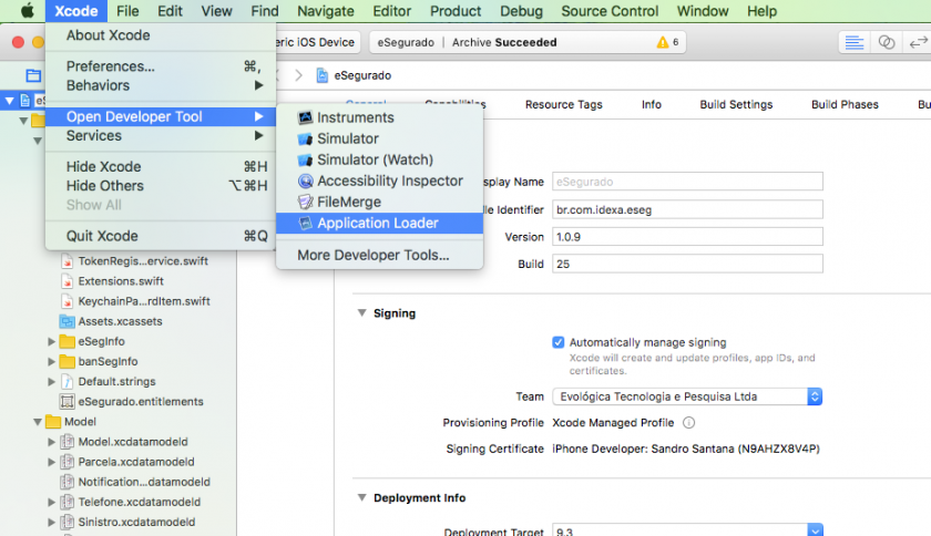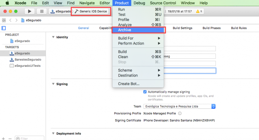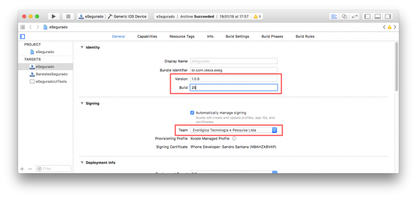 Defina o número da nova versão do app na tab "General". Verifique se o perfil de desenvolvimento é compatível com o envio. Ex: Para o envio do BanSeg o time designado deve ser o BANESTES SEGUROS SA, ou o arquivo será rejeitado no momento do envio.