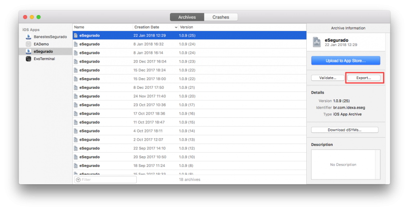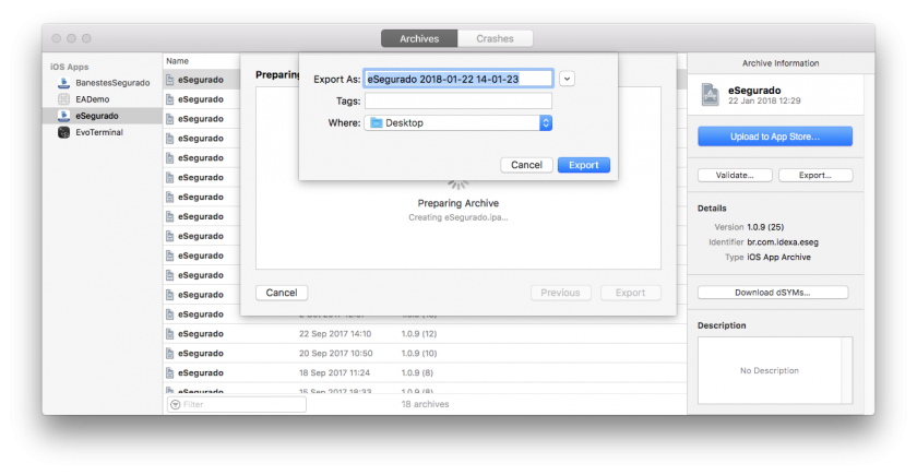 Selecione o destino do arquivo ".ipa" e pressione "Export". (Eu costumo salvar no Desktop para fácil acesso e remoção após o envio para o iTunes)